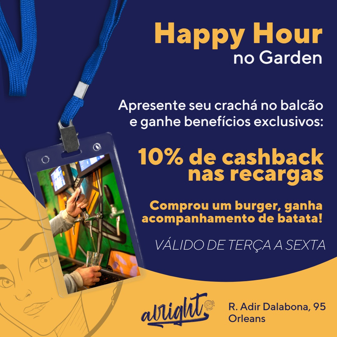 A Alright está com um promoção para as empresas parceiras. De terça a sexta você pode vir fazer um happy hour e ao apresentar seu crachá ganha 10% de cashback nas recargas, além de acompanhamento de fritas grátis nos pedidos de smash burguers.