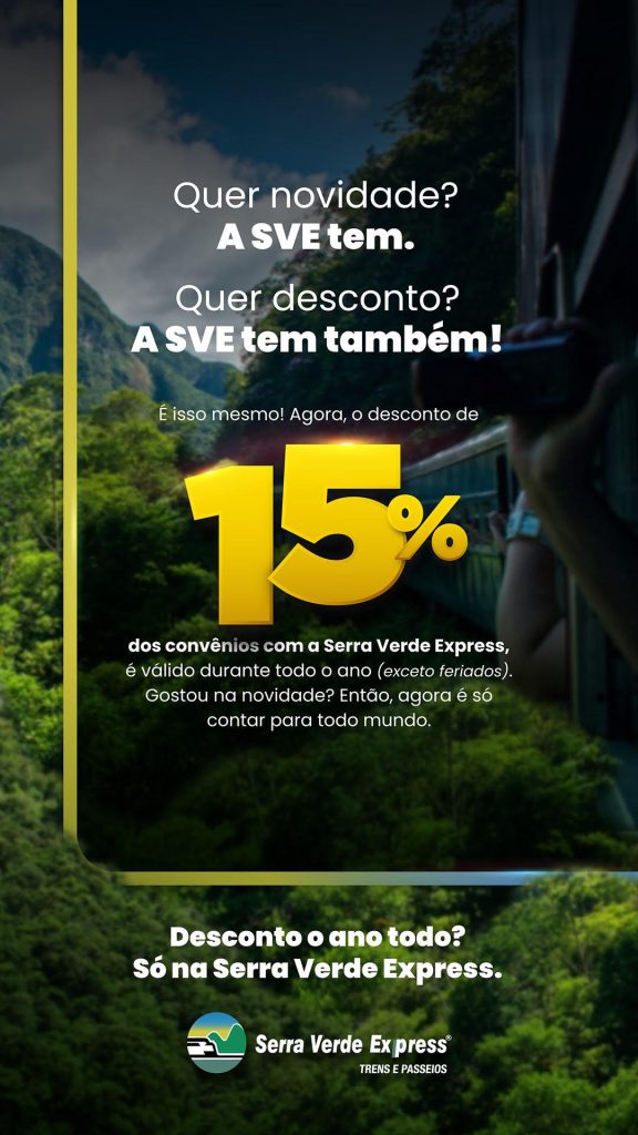 Aproveite o desconto de 15% para viajar de trem. Benefício válido para todos os meses do ano (exceto períodos de feriados). Site: https://serraverdeexpress.com.br/ Publicado em: 18 de janeiro de 2023